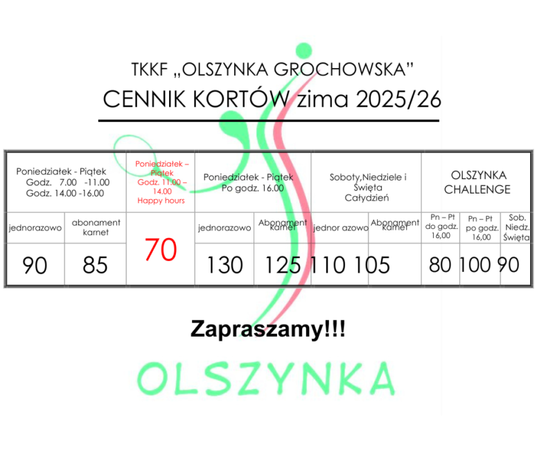 Kochani miłośnicy żółtej piłeczki i kortów Klub tenisowy Olszynka Grochowska – z przyjemnością chcielibyśmy Was poinformować, że decyzją Zarządu Klubu ceny wynajmu kortów w sezonie JESIEŃ/ZIMA 2025/2026 pozostają wg cennika jako obowiązywał w poprzednich latach 2022/2023 i 2024/2025 – brawo Zarząd i brawo Klub!!